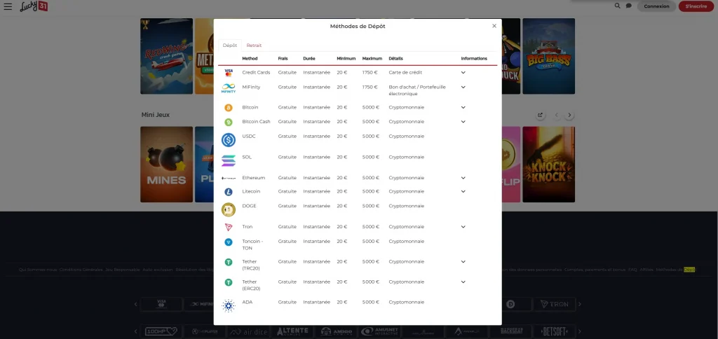Dépôts sur Lucky31 Rapides et Sans Frais